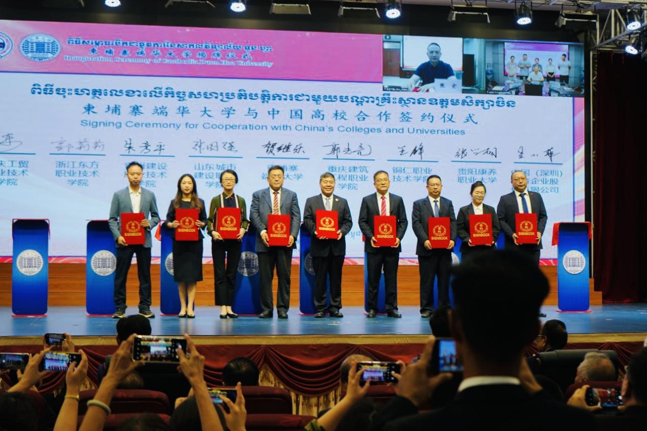 随后,浙江东方职业技术学院和重庆建筑工程职业学院等7所高校与柬埔寨端华大学签署海外工程技术学院共建协议。柬埔寨国王最高顾问(副总理级)、柬中友好协会主席艾森沃为浙江东方职业技术学院海外工程技术学院授牌。