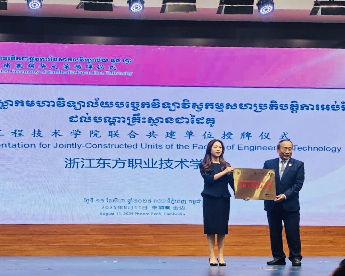 8月11日,柬埔寨端华大学浙江东方职业技术学院海外工程技术学院在柬埔寨端华大学开学典礼上正式成立,标志着学院国际化办学取得重要突破,为海外中资企业培养具有国际视野的高素质本土化人才搭建全新平台。