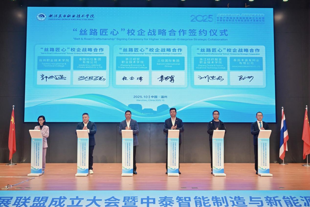 浙江东方职业技术学院携手温州市电子信息产业协会、浙江活水人才科技有限公司,举行“温州市电子信息产业学院”“产业人才学院”揭牌仪式;浙江经贸职业技术学院、台州职业技术学院、浙江纺织服装职业技术学院等中方院校,与泰国玛仕集团、丰盛发网业有限公司、三信国际集团等在泰中资企业签署“丝路匠心”校企战略合作协议,进一步打通“院校培养—产业需求”通道,为中泰产教融合注入实践动能。