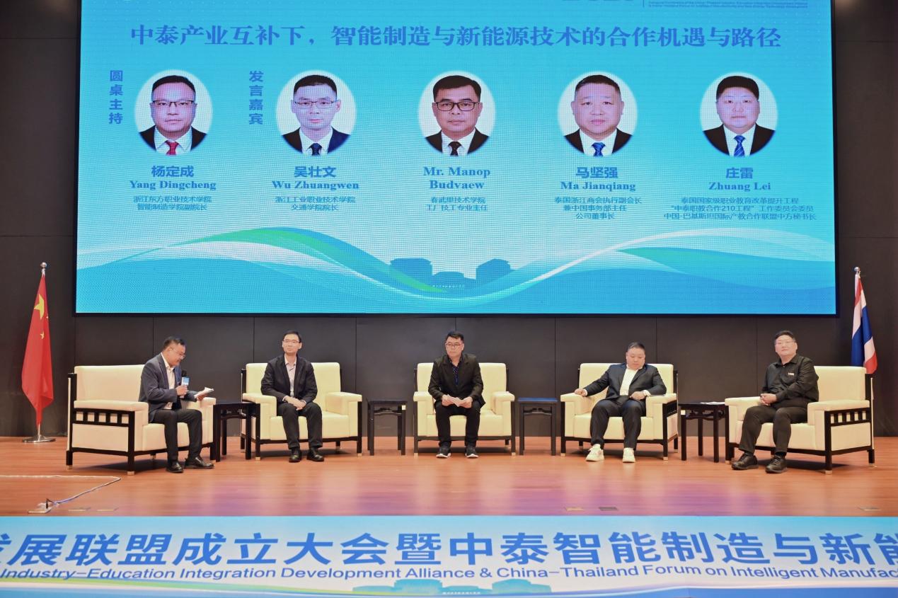 专家报告环节后,以“中泰产业互补下,智能制造与新能源技术的合作机遇与路径”为主题的圆桌论坛举行,浙江东方职业技术学院智能制造学院副院长杨定成教授担任主持人,浙江工业职业技术学院吴壮文教授、泰国春武里技术学院专业主任Mr.Manop Budvaew、泰国玛仕集团有限公司董事长马坚强、唐风国际教育集团中国业务中心执行总裁庄雷参与讨论。吴壮文教授从职教合作视角,分享“中文+职业技能”模式在中泰智能制造与新能源人才培养中的创新实践;Mr.Manop Budvaew结合院校案例,介绍泰方在课程标准共建、职业证书体系打造中的积极探索,助力合作本土化落地;马坚强董事长紧扣泰国“210工程”政策,剖析当地对复合型技术人才的迫切需求与中泰产业协同的价值共享路径;庄雷总裁则从企业实践出发,阐述唐风国际教育对接政策、承接合作成果、探索人才培养新方向的具体举措。整场论坛从院校、泰方实践、产业、企业多维度凝聚共识,清晰勾勒出中泰相关领域的合作路径,为后续工作推进提供了切实思路。