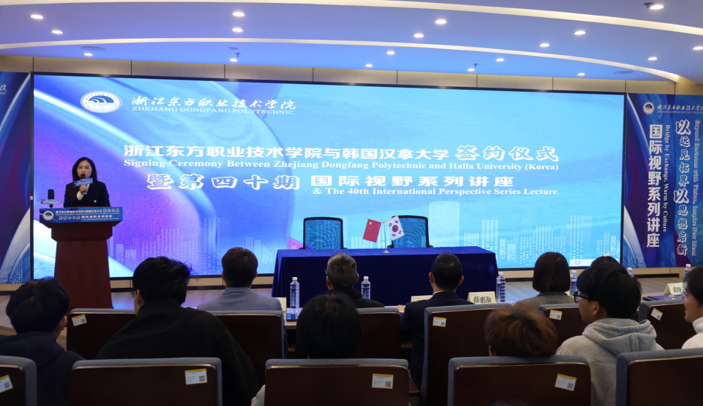 见面会后,浙江东方职业技术学院与韩国汉拿大学中韩人工智能国际教育交流合作签约仪式暨第四十期“国际视野系列讲座”顺利举行,活动由国际交流与合作处副处长郭莉莉主持。