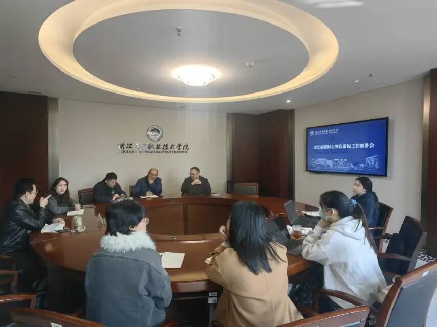 12月16日上午,浙江东方职业技术学院在行政楼802会议室召开2025级国际生寒假留校工作部署会。党委委员、副校长项忠出席会议并讲话,教务处、学工部、后勤处、保卫处、体育部、国际教育学院等相关部门负责人参会。