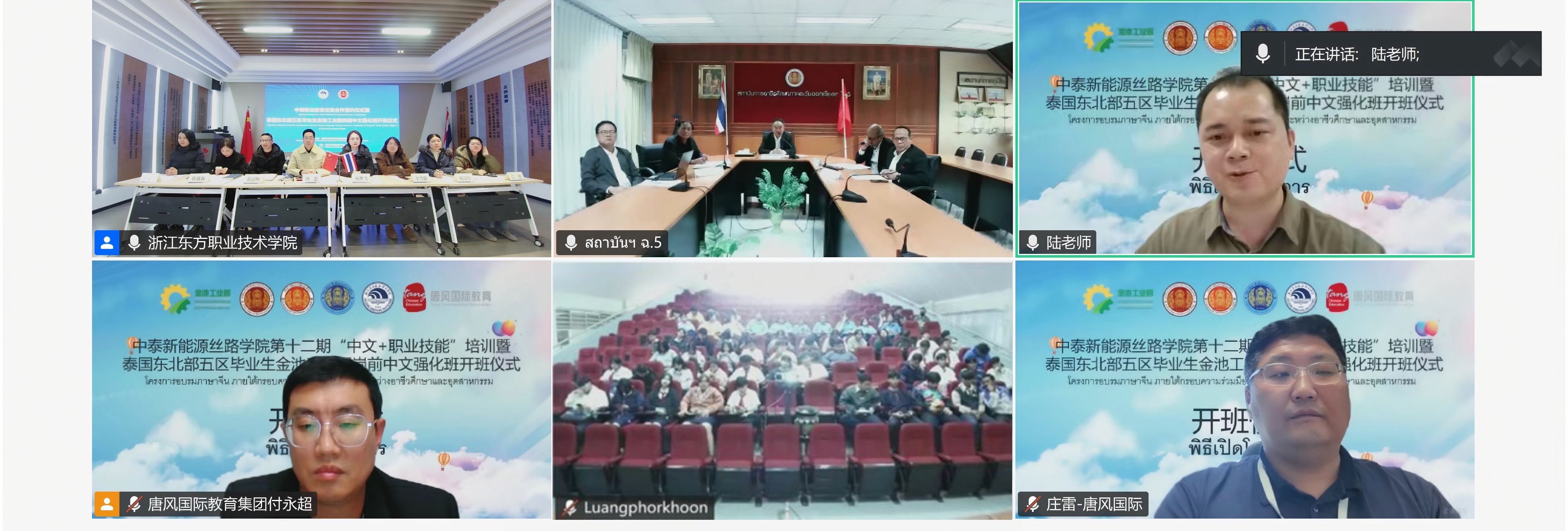 2026年1月21日,浙江东方职业技术学院举行中泰职业教育交流合作签约仪式暨泰国东北部五区毕业生金池工业园岗前中文强化班开班仪式。泰国东北部五区职业教育中心主任苏姆雷·旺萨达,副主任索姆普斯·因塔拉玛、贾伦·尤布鲁姆,助理主任阿迪松·西提,战略合作部主任威猜·纯查,唐风国际教育集团中国业务中心执行总裁庄雷等,泰国龙婆坤技术学院134名学生线上出席活动,浙江东方职业技术学院党委委员、副校长项忠参会,教务处、人工智能学院、国际教育学院等部门负责人共同与会。